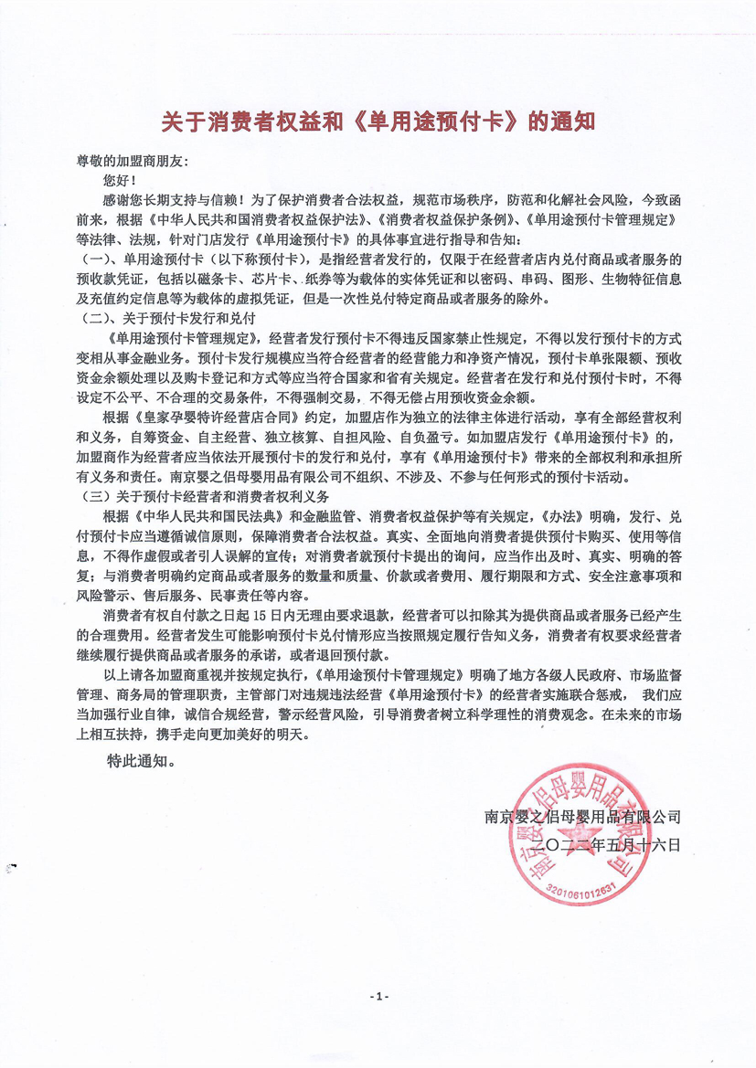 關於消費者權益和《單用途預付卡》的通知